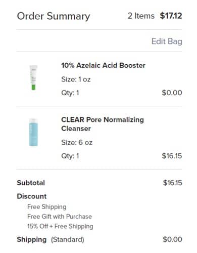 Target uneven skin tone and discoloration with this FULL SIZE gift with purchase! WHILE SUPPLIES LAST you’ll receive a FREE Paula’s Choice 10% Azelaic Acid Booster with any full size item purchase! That’s a $39 value Besties! To make the deal even better, use the code below for 15% OFF and FREE SHIPPING! With full size items starting as low as $19, you won’t want to miss this freebie! Check out our example cart below!