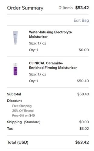 We love it when we have options Besties! WHILE SUPPLIES LAST receive a FREE FULL SIZE moisturizer with any $49 purchase! You’ll choose between the Water-Infusing Electrolyte Moisturizer, CLEAR Oil-Free Moisturizer, and the RESIST Skin Restoring Moisturizer with SPF 50! That’s UP TO a $38 value! Even better, stock up today because Paula’s Choice Retinol is 20% OFF! Take a look at our example cart below!