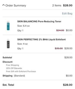 Paula is bringing it with savings and a new FULL SIZE freebie! Take 20% OFF the bestselling Paula’s Choice Skin Perfecting 2% BHA Liquid Exfoliant PLUS you’ll receive a FREE FULL SIZE Skin Balancing Pore-Reducing Toner! Minimize the appearance of pores, tackle fine lines and wrinkles, uneven tone and texture with this power duo! Check out our example cart below!
