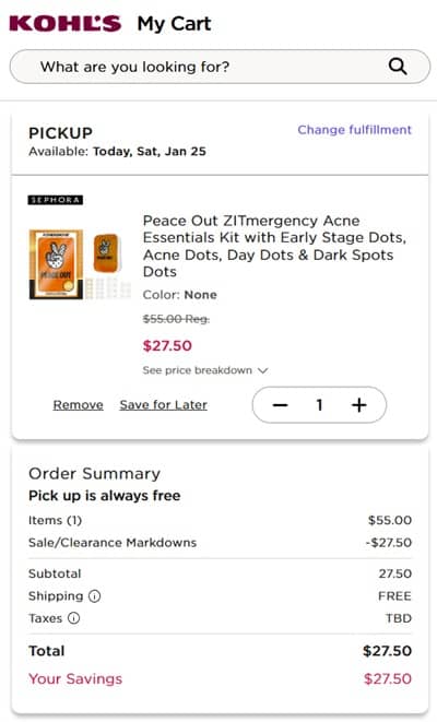 Say goodbye to breakouts with HALF OFF savings! Take 50% OFF the Peace Out ZITmergency Kit WHILE SUPPLIES LAST at Sephora in Kohl’s! This $85 value includes everything you need to banish blemishes! Original Acne Dots, Acne Day Dots, Early Stage Acne Dots, Dark Spots Dots, and a zippered pouch to hold them all in! Yours for only $27.50! Check out our value breakdown below that includes the additional bonus offer!