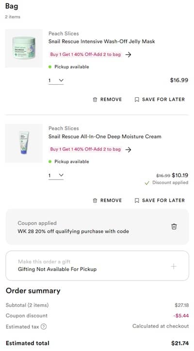 You know we love our stacking savings Besties! Buy 1 Peach Slices skincare item and you’ll save 40% OFF a second PLUS use the code below to save an additional 20% OFF at Ulta Beauty! Get that lit from within glow for less! Check out our example cart below! Be sure to add on the FREE 8 Piece Skincare Gift with any $50 purchase if your order qualifies!