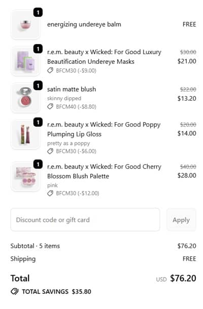 Get that magical glow for less Besties! Save 30% OFF your makeup faves during the r.e.m. beauty Black Friday Sale Event! This sale does including the Wicked For Good Collection and sets! PLUS you’ll receive a FREE Full Night’s Sleep Energizing Undereye Balm with any $75 purchase! Select items are UP TO 50% OFF, now’s the time to add to cart!