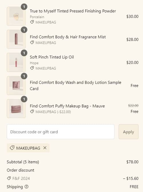 - FREE Find Comfort Puffy Makeup Bag (must add to cart) with any $75 purchase use code MAKEUPBAG (click to copy) $22 value