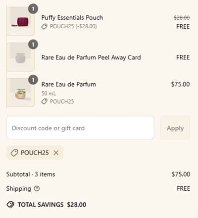 Rare Beauty is treating us to a freebie so today’s the day to discover a new favorite! Receive a FREE Puffy Essentials Pouch with any $75 purchase! Whether you’re adding the caramel, pistachio, and pink pepper notes in the newest Rare Eau de Parfum to your collection or just restocking your must haves, be sure to add on this freebie before you check out!