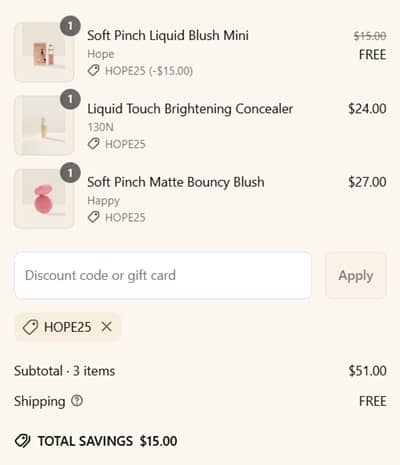 Get that summer glow on with a freebie from Rare Beauty! Receive a Rare Beauty Soft Pinch Blush Mini FREE with any $50 purchase WHILE SUPPLIES LAST! This bestselling weightless, radiant finish liquid formula in the shade Hope, a nude mauve, will become your newest favorite!