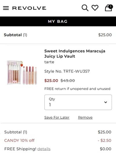 Use the Revolve coupon code CANDY to save an ADDITIONAL 10% OFF OR save an ADDITIONAL 15% OFF if signed up for SMS notifications using the code REVINSIDER15 (exclusions may apply).