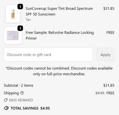 Stay safe in the sun for less with a skincare-infused fan favorite! Take 35% OFF the RMS Beauty SunCoverup Super Tint Broad Spectrum SPF 50 Sunscreen for a LIMITED TIME ONLY! This lightweight, sheer tinted moisturizer hydrates for a natural, radiant finish!
