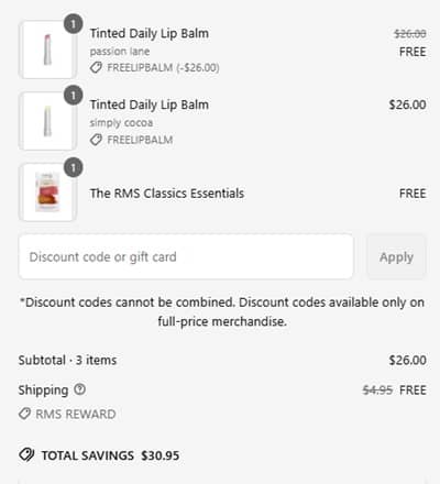 No code needed, add two RMS Beauty Tinted Daily Lip Balm to cart and one will become FREE. FREE SHIPPING applies automatically at checkout. Take a look at our other favorite finds!