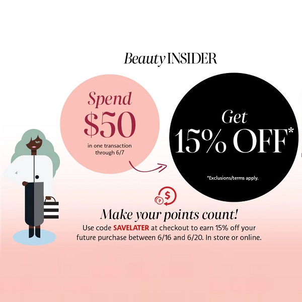 Spend $50 to get 15% OFF! Save 15% on a future purchase between 6/16 and 6/20 when you spend $50 in one transaction by 6/7 at Sephora! Use the code SAVELATER at checkout to activate the offer. Use the code FREESHIP for FREE SHIPPING with no minimum! Exclusions may apply. An email confirming your discount will be sent 24 hours after you shop.
