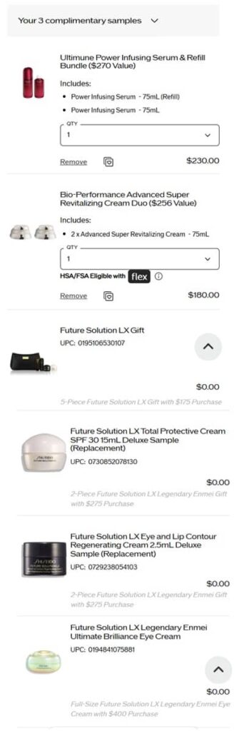 - FREE 5 Piece Future Solution LX Gift + 2 Future Solution LX deluxe samples + a FULL SIZE Future Solution LX Legendary Enmei Ultimate Brilliance Eye Cream with any $400 purchase