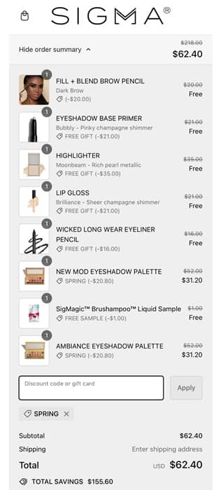 Step into spring with something new from Sigma Beauty! Take 40% OFF your makeup and brush purchases! PLUS you’ll receive a FREE 5 Piece Gift filled with FULL SIZE favorites on orders $100+! Influencer collabs, including sets, are 30% OFF! Take a look at our example cart below!