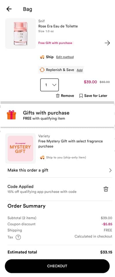 Discovery your new signature scent! Save 40% OFF the SNIF Rose Era Eau de Toilette PLUS save an additional 15% OFF when you make your purchase in the Ulta Beauty APP using the code below! An APP Exclusive, this fruity floral with notes of rose and strawberry will become your every day go to! You’ll even receive a FREE Mystery Gift with select fragrance items! Take a look at our example cart below!