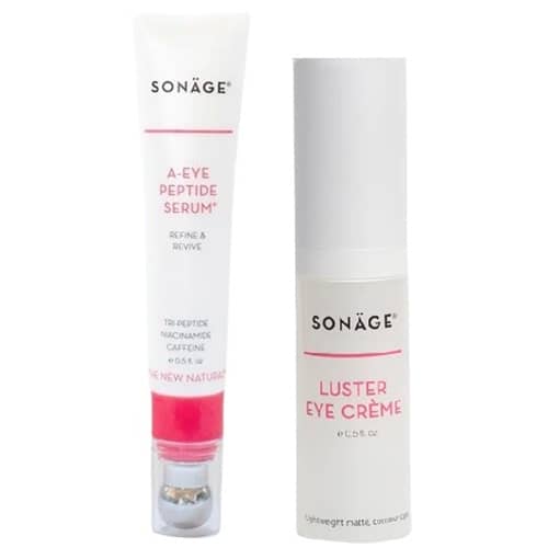 Wake up those tired eyes! Score a FREE FULL SIZE Sonäge Eye Serum or Eye Creme with any full size moisturizer purchase! Add your favorite moisturizer to cart and you’ll receive a FREE Luster Eye Creme or A-Eye Peptide Serum! Target wrinkles, fine lines, puffiness, and firmness! Check out our example cart below!
