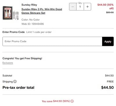 No code needed, eligible Sunday Riley Gift Sets are priced as marked. The FREE gift with purchase will add to cart once your order qualifies. Sign in to your Macy’s Star Rewards account (free to join) for FREE SHIPPING on orders $25+ or choose free in store pick up if available in your area. Check out our other favorite Macy’s finds!