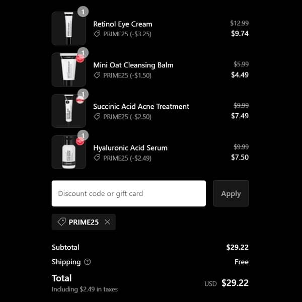 Sign in to your account and use the INKEY List coupon code PRIME25 to add the discount at checkout. FREE SHIPPING applies to orders $15+. Excludes sets. Other exclusions may apply. Take a peek at our other favorite deals!