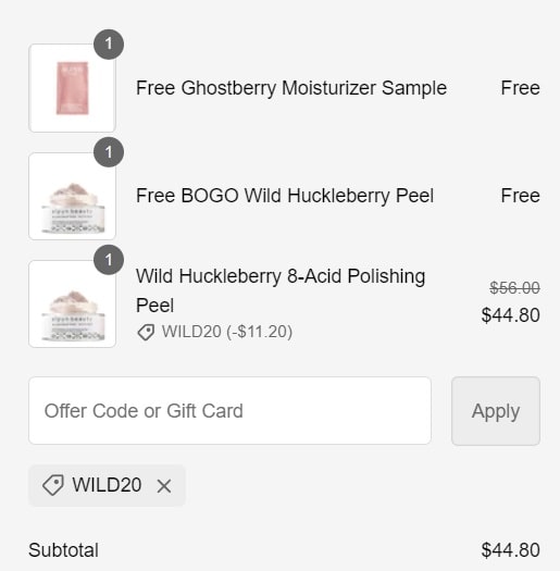No code needed, add one Wild Huckleberry 8-Acid Polishing Peel to cart and a second will automatically add for FREE. New customers use the coupon code WILD20 (click to copy) to save an additional 20% OFF. FREE SHIPPING applies to orders $50+. Take a look at our other favorite finds!