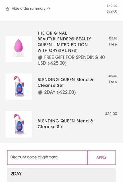 One for you and one for your Bestie! TODAY ONLY score 2 beautyblender Blending Queen Blend and Cleanse Sets for the price of 1 PLUS you’ll get FREE SHIPPING! To make the deal even sweeter, you’ll receive a FREE Original Beauty Queen Limited Edition Sponge with Crystal Nest, a $25 value, with orders $40+! Take a look at our example cart below! Each set includes a Sapphire Makeup Sponge and a Limited Edition Solid Glitz Blendercleanser!