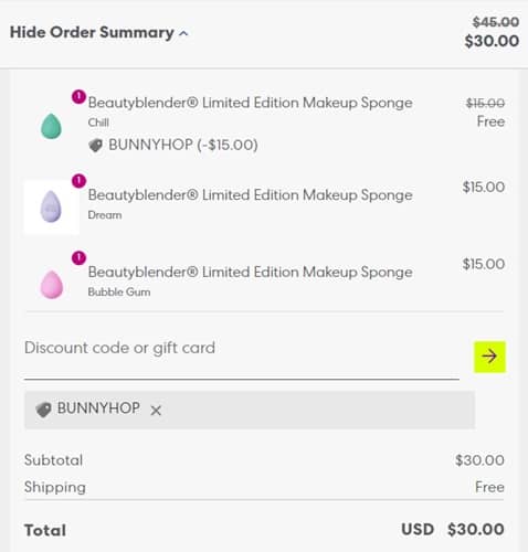 Add 3 eligible beautyblender makeup sponge to cart and use the beautyblender coupon code BUNNYHOP (click to copy) for one to become FREE. FREE SHIPPING applies to all orders automatically at checkout. Take a look at our other favorite finds!