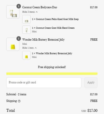 FREE SHIPPING and a freebie? Yes, please! Receive a FREE 8oz Beekman 1802 Wonder Milk Buttery Botanical Jelly with any $17 purchase TODAY ONLY! Lock in moisture with this fast absorbing, non greasy formula for long lasting ultra hydration! Bestie Stevie is a long time fan of the Beekman 1802 Bar Soaps, it’s stock up time! Check out our example cart below!