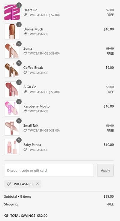 Add 2 eligible ColourPop Lip items to cart and use the ColourPop coupon code TWICEASNICE (click to copy) and the lowest priced one will become FREE. FREE SHIPPING applies to orders $35+. Excludes Fresh Kiss Glossy Balm and sets. Other exclusions may apply. Take a look at our other favorite finds!