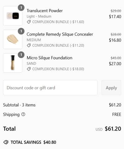 Maximize your savings with a bundle! TODAY ONLY score 40% OFF the Elcie Cosmetics Complexion Bundle with FREE SHIPPING! This set includes the lightweight, buildable Micro Silque Foundation, Complete Remedy Silque Concealer, and the Translucent Powder! Everything you need for a flawless base!