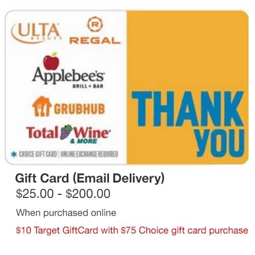 Here’s a gift with purchase you won’t want to miss! Receive a FREE $10 Target gift card with your $75 Choice Gift Card purchase TODAY ONLY! After purchase you’ll exchange your Choice gift card at redeem.giftcards.com for your choice of egift cards to spend at various retailers like Ulta Beauty, select theaters, restaurants, and more!
