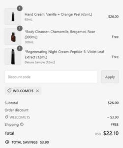 New customers use the coupon code WELCOME15 (click to copy) to save 15% OFF your first purchase. The FREE gift with purchase will add automatically. Don’t forget to add your FREE sample. FREE SHIPPING applies automatically at checkout. Take a look at our other favorite finds!
