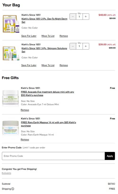 - FREE Avocado Eye Treatment 7ml + FREE Rare Earth Masque 14ml with any $85 Kiehl’s purchase