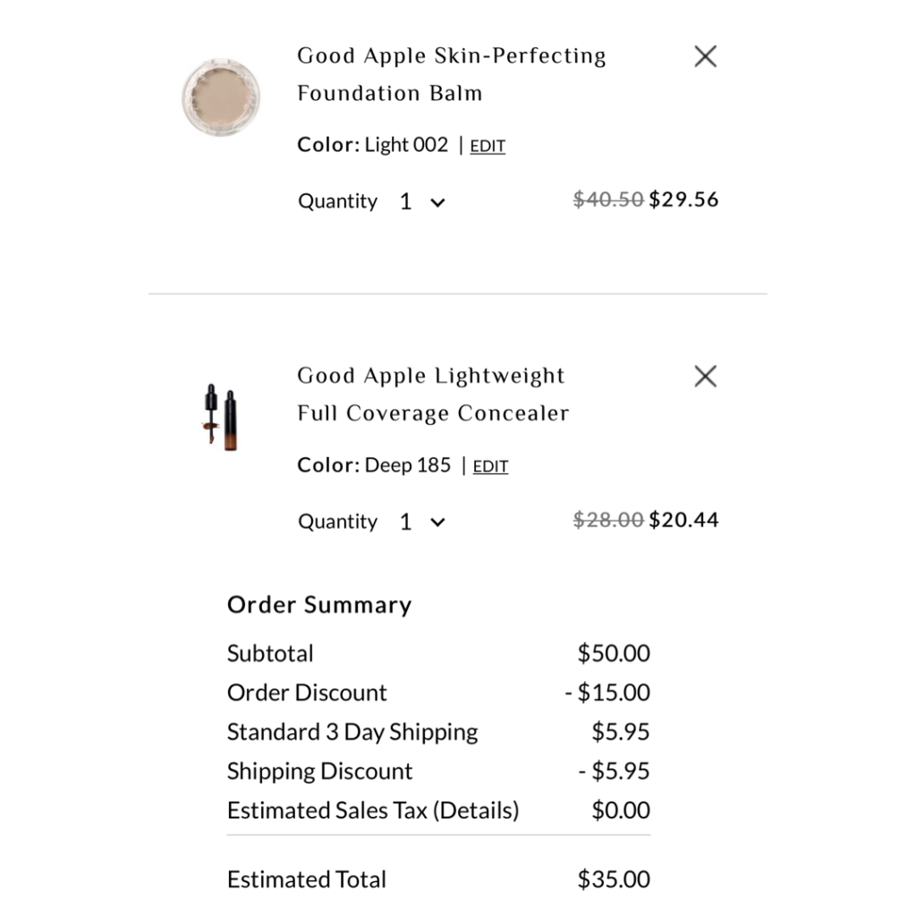 Hurry Besties, this deal is hot! The KVD Vegan Beauty Good Apple Bundle is $35! This kit contains a FULL SIZE Good Apple Foundation Balm and a FULL SIZE Good Apple Concealer, valued at $68.50 if purchased separately PLUS you’ll get FREE SHIPPING! See the example cart below! Hurry before time runs out!