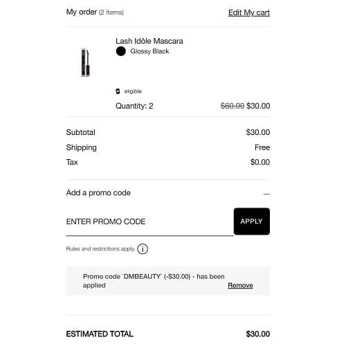 To take advantage of the offer, just add 2 like items to cart and use the Lancôme coupon code DMBEAUTY, one will become FREE.