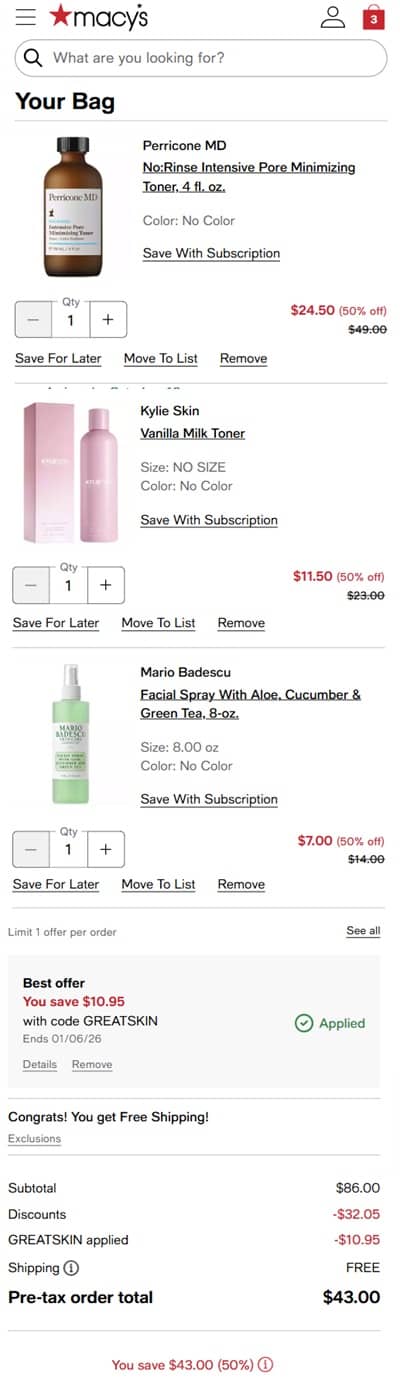 No code needed, eligible items are priced as marked. Use the Macy’s coupon code GREATSKIN for FREE SHIPPING on Macy’s 7 Days of Great Skin items or choose FREE in store pick up if available in your area. Take a look at our other favorite finds!