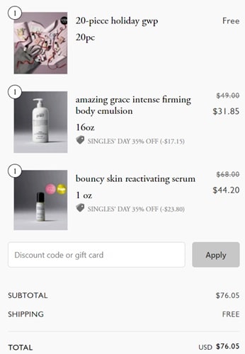 *Excludes: Discounted value or gift sets, amazing grace intense shower gel, amazing grace intense firming body emulsion, amazing grace intense whipped body creme, purity made simple cleansing duo set, amazing grace discovery set, holiday all skus. Other exclusions may apply.