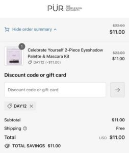 Use the PÜR Cosmetics coupon code DAY12 (click to copy) to add the discount to your cart. FREE SHIPPING applies automatically at checkout.