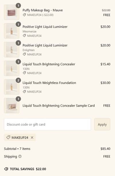 - FREE Find Comfort Puffy Makeup Bag (must add to cart) with any $75 purchase use code MAKEUP24 (click to copy) $22 value
