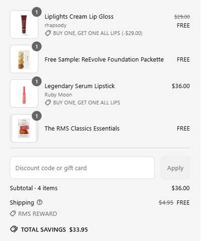 No code needed. Add 2 eligible RMS Beauty lip items to cart and the lowest priced one will become FREE. Don’t forget to add your FREE sample. Rewards members (free to join) enjoy FREE SHIPPING so be sure to sign in to your account. Take a look at our other favorite finds!