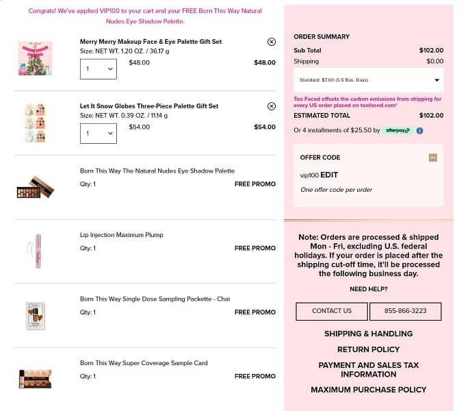 Grab this VIP offer before it’s gone! You’ll receive a FREE Too Faced Born This Way The Natural Nudes Eyeshadow Palette, a $52 value, PLUS a FREE FULL SIZE Lip Injection Maximum Plump, a $33 value, with any $100 purchase! Check out the new holiday collection or stock up on your tried and true staples! What’s in your Too Faced cart?