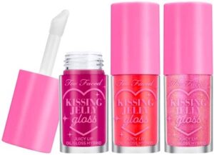 Perfect that pout with something new from Too Faced! The Kissing Jelly Lip Oil Gloss Trio is only $34 with FREE SHIPPING at HSN! This set includes 3 FULL SIZE lip oil/gloss hybrids in the shades Bubble Gum (pink with shimmer), Raspberry (electric fuchsia), and Sour Watermelon (electric pink)! Regularly $22 EACH, soften and nourish with a sheer wash of color!