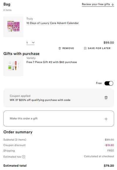 Activate any points multiplier offers you may have available to you. Use the Ulta Beauty coupon code 978833 (click to copy) to save 20% OFF your qualifying non prestige purchase (exclusions apply). FREE SHIPPING for Ulta Beauty Rewards Credit Card purchases or orders $25+ for Diamond members and $35+ for everyone else. Take a look at our other 2024 Advent Calendar value breakdowns!