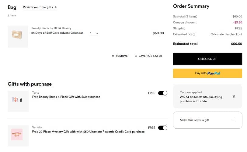 - FREE 20 Piece Mystery Gift with any $50 Ultamate Rewards Credit Card purchase (currently works with any payment method)