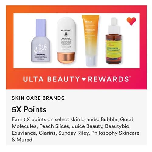 We’ve got more Member Love today Besties! Ulta Beauty Rewards members (free to join) earn 5X points on select skincare brands! Choose your faves from Bubble, Clarins, Exuviance, Good Molecules, Juice Beauty, Moon Juice, Murad, My Clarins, Peach Slices, philosophy, and Sunday Riley. Remember, you must activate the offer for it to apply! Be sure to add any FREE gifts with purchase that your order may qualify for!