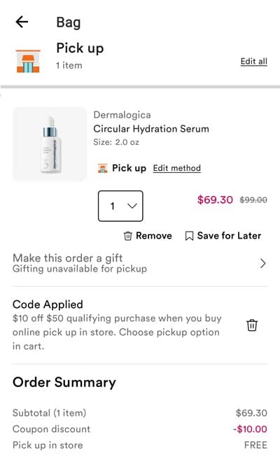 Activate any points multiplier offers you may have available to you. Use the code QUICK to save $10 OFF your BOPIS orders $50+ (including Prestige and Fragrance) Platinum and Diamond members enjoy FREE SHIPPING with any Beauty Steal purchase or FREE SHIPPING on orders $25+ for Diamond members and $35+ for everyone else. Check out our other favorite Ulta Beauty finds!