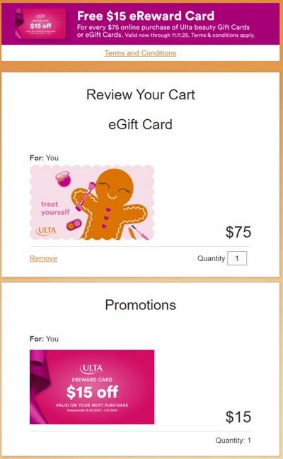 At check out you may choose to have your e-giftcard emailed by Ulta Beauty or request a link to email or text yourself! The promotional Ulta Beauty $15 eReward card is redeemable 12/26/2025 – 1/31/2026. Check out our other favorite Ulta Beauty deals!