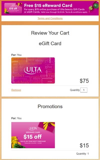 At check out you may choose to have your e-giftcard emailed by Ulta Beauty or request a link to email or text yourself! The promotional Ulta Beauty $15 eReward card is redeemable 12/26/2025 – 1/31/2026. Check out our other favorite Ulta Beauty deals!