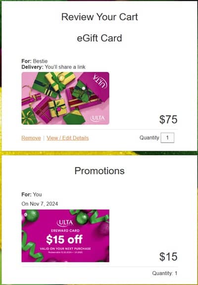 At check out you may choose to have your e-giftcard emailed by Ulta Beauty or request a link to email or text yourself! The promotional Ulta Beauty $15 eReward card is redeemable 12/26/2024 – 1/31/2025. Check out our other favorite Ulta Beauty deals!