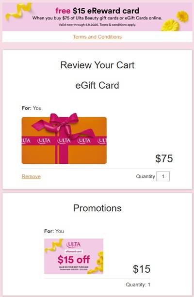 At check out you may choose to have your e-giftcard emailed by Ulta Beauty or request a link to email or text yourself! The promotional Ulta Beauty $15 eReward card is redeemable 5/12/2025 – 6/15/2025. Check out our other favorite Ulta Beauty deals!