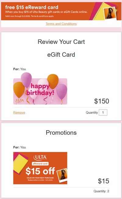 At check out you may choose to have your e-giftcard emailed by Ulta Beauty or request a link to email or text yourself! The promotional Ulta Beauty $15 eReward card is redeemable 8/3/2025 – 9/13/2025. Check out our other favorite Ulta Beauty deals!