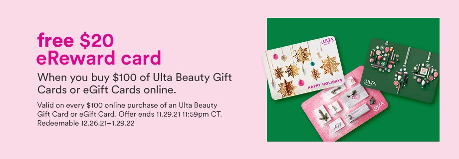 One of our favorite holiday promotions is back at Ulta Beauty! For a LIMITED TIME ONLY, get a FREE eReward card for every $100 gift card or e-gift card purchased online*! To purchase, search “gift card” on the Ulta Beauty website or app!