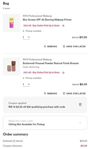 Use the Ulta Beauty coupon code 989045 (click to copy) to save $3.50 OFF your qualifying non prestige purchase of $15+ (exclusions apply). Choose in store pick up to add the offer to your cart. Pick up your purchase within 5 days of your Ulta Beauty BOPIS order.