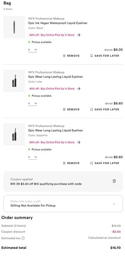 Stacking savings alert besties! Save 40% OFF NYX Professional Makeup Eyeliners when you BOPIS, buy online pick up in store at Ulta Beauty! PLUS use the code below to save an additional $3.50 OFF your $15+ purchase! Creamy pencils, waterproof liquid, blendable multi-taskers! With prices starting as low as $3, you can’t afford to miss this deal! Be sure to add on the FREE 17 Piece Body Care Set with any $90 purchase if your order qualifies!
