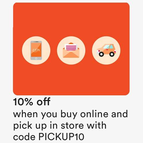 *Coupon only available for items purchased online and picked up in store or curbside within 5 days of order date. Excludes: CHANEL, N°1 DE CHANEL, Dyson, 5 for $5, 5 for $10, Beauty Steals® or clearance. Not valid at Ulta Beauty at Target, Target.com, or Ulta Beauty via third-party marketplaces. Other exclusions may apply.